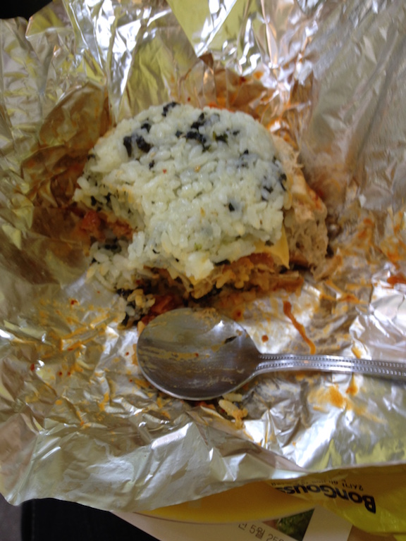 番外で巨済(コジェ)の古県バスターミナルにあった全国チェーン(釜山とソウルで見たから)のライスバーガー店で食べたライスバーガー。キムチの入っていないのを頼んだはずなのに、しっかり入っているという…。