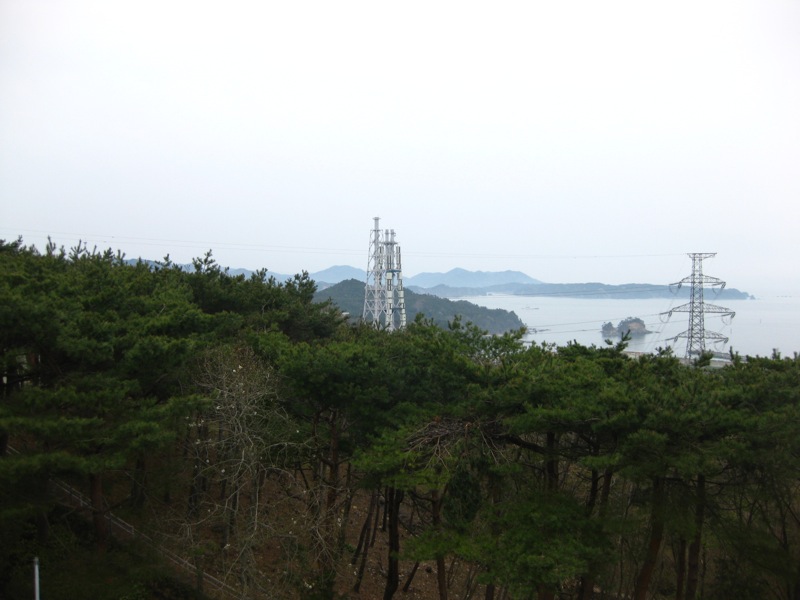 やっとPRセンター(入場無料。付属施設は何もなし。お土産にボールペンをくれるだけ。頼めば解説ぐらいはしてもらえるよう)に到着。2階から見た原発の鉄塔。今は停止中。