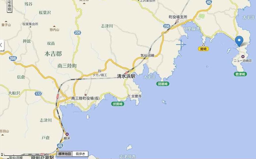 地図の右端にニュー泊崎荘。地図の真ん中左寄りに南三陸町役場(仮)があって、ボラセンもそこ。この間、約10km以上、車で走ると20分くらい。