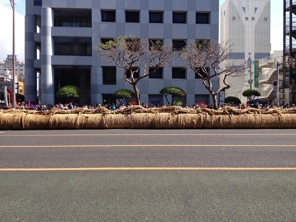 その後、58号線の久茂地交差点まで移動し、そこで綱挽の本番だったんですが、おなかの調子が悪くてリタイアしたので、開会式の来賓挨拶途中で抜け出しました。いや、ほんと、まじで辛かった…