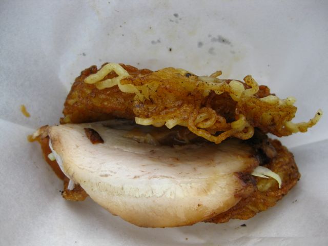 ラーメンを焼いて、それでチャーシュー、白髪葱、ナルトを挟み、醤油・味噌・豚骨・塩のたれをかけます。4軒ぐらいあったので、今年のヒット作かも。