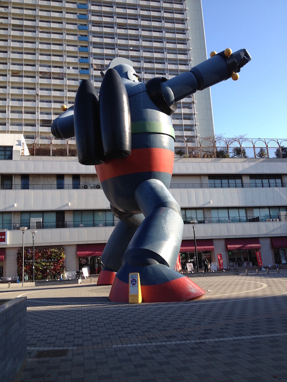 駐車場から出てきて、背面から見た鉄人28号。おなじみの勇ましいポーズです。