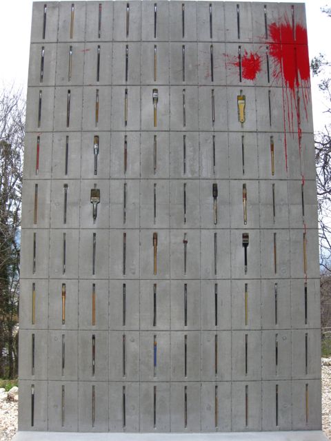 赤いペンキが印象的で、もしや、無言館に収められた画学生たちの筆か〜?と思ったのですが、そこまで大げさなものではなくて、現代の画学生の絵筆だそうな。確かに遺品とかだったら、風雨雪で傷むから、現実的ではないな。ペンキは、無言館の看板にペンキを塗られた事件が前にあって、いろいろな立場の人がいる中に建っているという意識のもと、復活させたそうだ。
