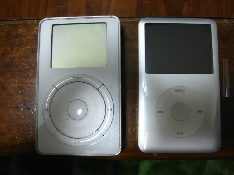 新旧iPodちゃん比較。厚さは旧製品の半分くらい。いや〜、技術の進歩ってほんとにすごいですね(棒読み)