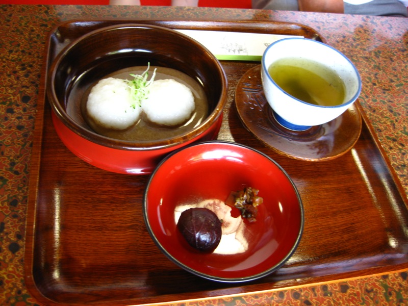 クルミおはぎは本堂の裏手でいただきます。一人前700円です。奥の2つあるのがそれです。餡がクルミです。手前のは、やたらに臭いのきつい古漬けと紫蘇を巻いた梅です。