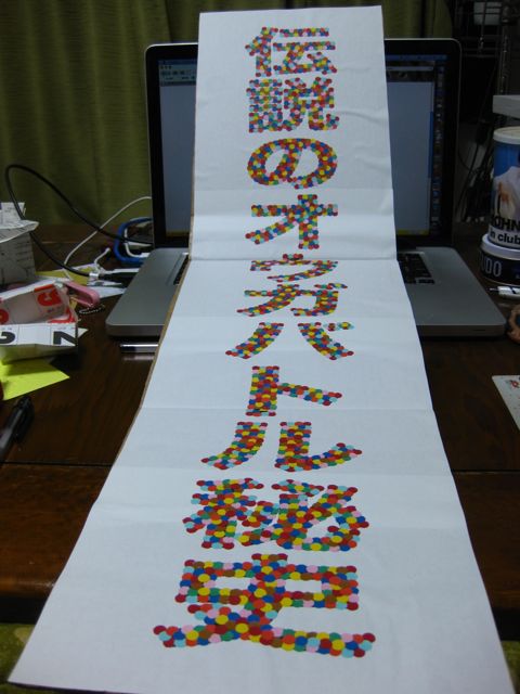 最初はでかい文字を印刷して、1枚につなげただけだったのですが、黒い文字でインパクトに欠けるな〜と思いました。