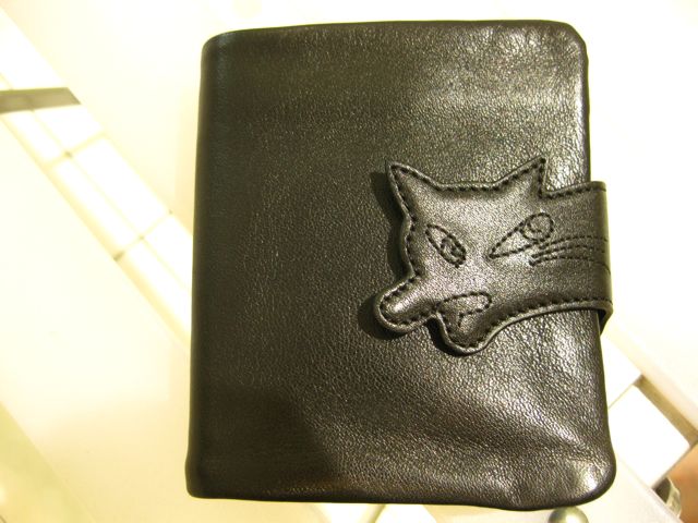そして、行きました、ワチフィールドのお店に。ここは猫のダヤンで有名なんですが、オーダーメイドの革製品も売ってるんですね〜 で、財布を手に取ると、店員さんが「向きはどっちですか?」と訊いてきました。いや、今までさ、財布もいろいろ見たけれど、声をかけられたのなんて初めてさ。で、その時、手にしていた財布が例によって逆だったので、反対のがいいな〜と言ったら、持ってきてくれたんですよ、その財布を!! ああ、ここにわしの求める財布はあったのだ、と思って、サイズを考えずに勢いで買ってしまいましたが、カードを入れたら、例によってぱんぱんになったので、要らないカードを吟味しないとならないけど、向きは理想的なので、言うことないんだぜ (`・ω・´)
