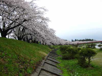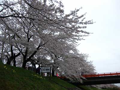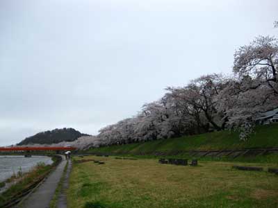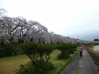 桧木内川沿いの桜は約2kmに及ぶ。北上展勝地と同じ規模ですな。で、途中の橋から北側を望んだところ。
