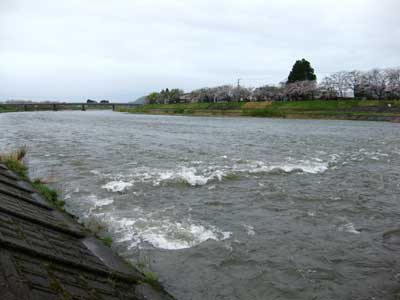 濁流になってる桧木内川。普段はもっと穏やかな川の流れなのだと思う。見たことがないから間違ってるかもしれない。