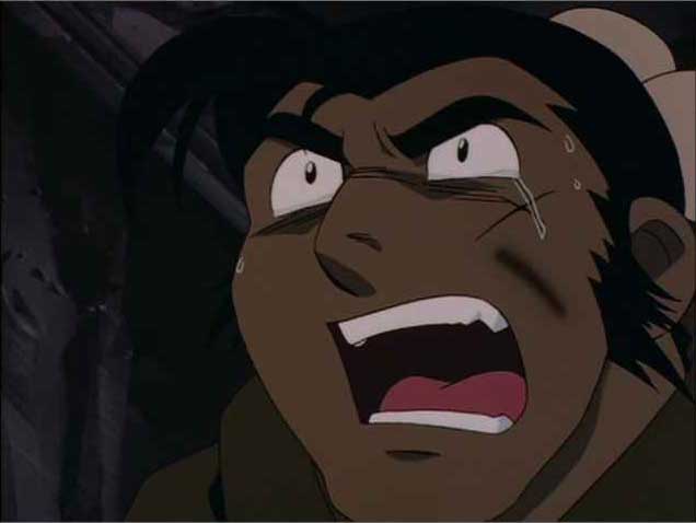 ただ、どっちかというと、頭脳派でない鉄牛ですから、立てた作戦もわりと単純なものでしたし、伏兵コ・エンシャクをすっかり忘れていたようなので、一度はコ・エンシャクに倒されてしまいますが、そこは鉄牛、「しゃらくせぇ!」の一言で復活します。楊志の姐さんも苦戦させられたコ・エンシャクを一撃(スタッフによると、コ・エンシャクは仮面が弱点なんだそうで、鉄牛に仮面を割られたので苦しんだそうです。そのわりにはラストでしっかりアルベルトを捕縛しとったけどな)、幻夜に撃たれても前進を続け、ついにはギャロップでご臨終…と思わせておいて、つぶされたシーンがないので(演出ではいかにも鉄牛が逃れようがなかったみたいな感じだけど、実際につぶされた描き方はしてない)、しっかりLast Episodeで復活するわけでありますが、血の独白に続きます。