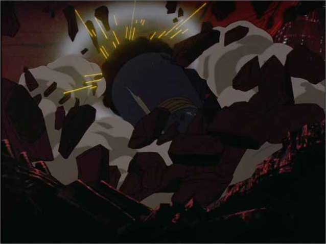 立ち上がったロボは、大怪球の捨てた外壁を楯に、エネルギーフィールドの突破を試みる。