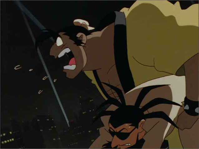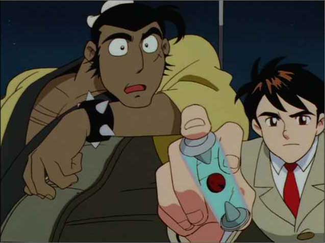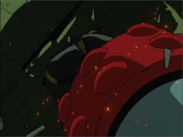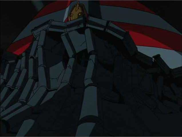 さらに、Episode 1の冒頭、銀鈴と鉄牛とシズマ博士のトレインチェイスに続きまして、ロボの登場シーン。いや、トレインチェイスも正直好きなシーンであります。なんちゅうても荒唐無稽なアクションシーン。何度も書いてますし、いくらでも言いますが、アニメなんですから、おもしろくなければあきません。現実にはありえね〜ッ!な角度を駆け上る銀鈴と鉄牛、列車を追ってきたBF団のロボと同じ速さで疾走する銀鈴と鉄牛、ありえね〜ッ!の代表格みたいなもんですが(ま、正直言って、「ジャイアントロボ」はそういうありえね〜ッ!なアクションシーンのオンパレードみたいなもんですが)、ここでBF団ロボに追い着かれたらおもしろくないでしょ。坂を駆け上れなかったらおもしろくないでしょ。いいんですよ、彼らはエキスパートなんですから。いいんですよ、リアルさなんかなくたって。すごい坂を駆け上るエキスパート、だからおもしろいんじゃないですか!