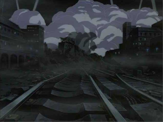 遠く門まで吹き飛ばされるBF団ロボ。列車の疾走シーンがありますから、かなりの重量なのは明白です。それをパンチひとつで吹き飛ばすジャイアントロボのパワーの凄まじさ。