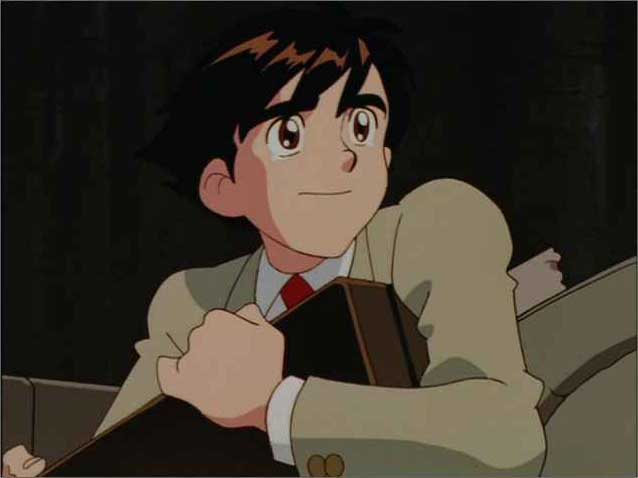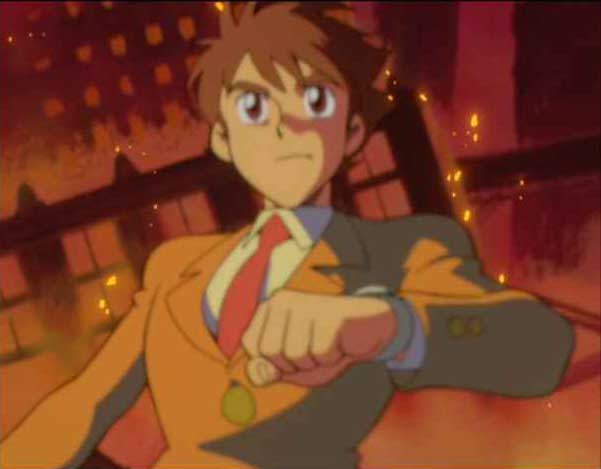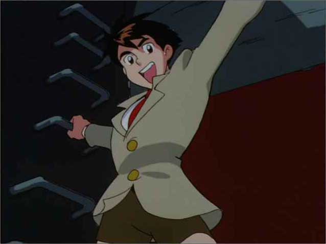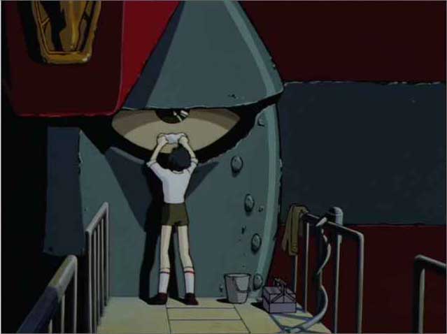 Last Episodeでオープニングのロボの最後のパンチ出すシーンを載っけましたが、ロボちゅうたら、こっからです。「砕け、ジャイアントロボ」と大作が言い、ぐるっと一回転、実はロボにつかまってました、とロボの顔の半分が出て、アップ、バストショット、ロング、全身図、ロボぱ〜んちと至る一連のシーンのしょっぱなです。ここが大事なのです。ここでロボにときめいたのです。一目惚れってやつです。ロボットだけど。