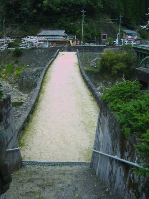じゃん! 通潤橋の上はこうなっている。人間が歩けるようになっており、対岸に渡れる。水道路なので、石畳が3本並んでいるのがそれだ。