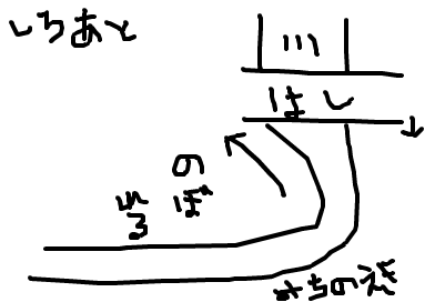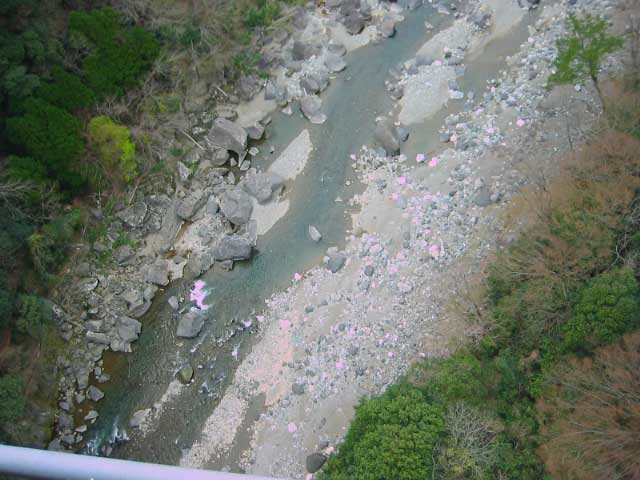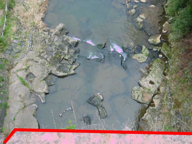 たきがは、実は高いところから下を見るのが好きなのだ。通潤橋の上から川面を見下ろしてみた。さっき鯉のいたお堀はこの川につながっている。赤線から下が通潤橋だ。