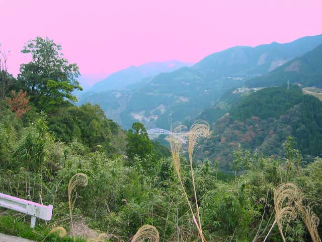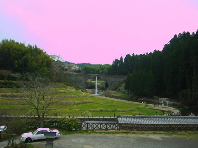 で、通潤橋よりも手前の霊台橋で早速、記念撮影。と言ってもたきがはは写真嫌いなので自分が映った写真を持つことは稀だ。霊台橋の手前に霊台公園ちゅうのがあって、まずはそこからの眺め。