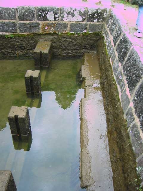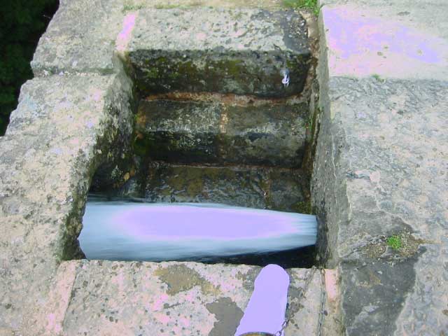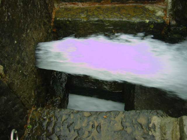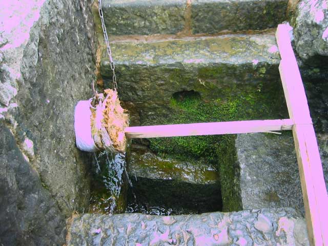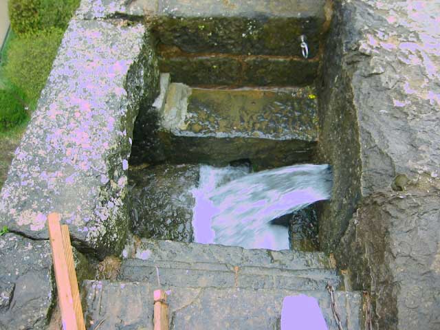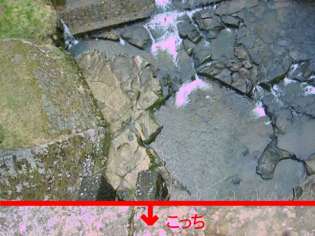 実際はここから水が出てる。さっきの栓もここにはまってた。勢いがあるうちは壁面の穴まで水がいくわけだが、だんだん勢いがなくなってくると