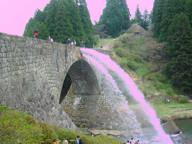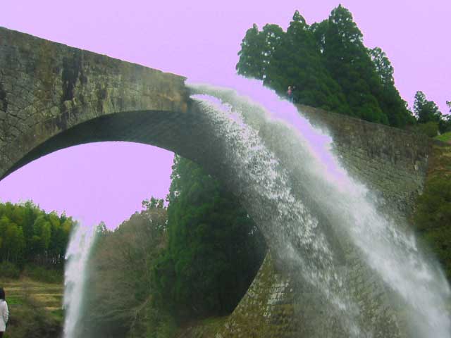 滝の音がするので何かと思ったら、通潤橋の脇に流れる人工の滝。