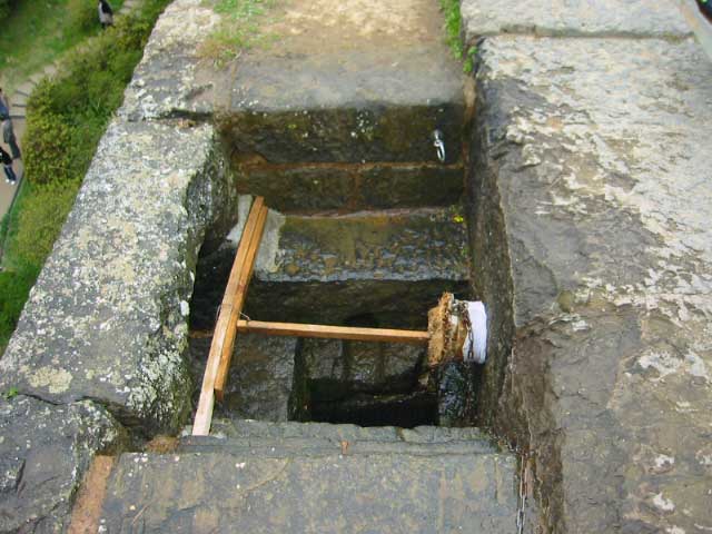 やがて正午がやってきた。係のおじさんが栓を抜くのを見守る観光客。その動きは動画で撮ったんだが、たぶん、忍者ブログにアップできる512kb切れないと思うので載せないことにする。