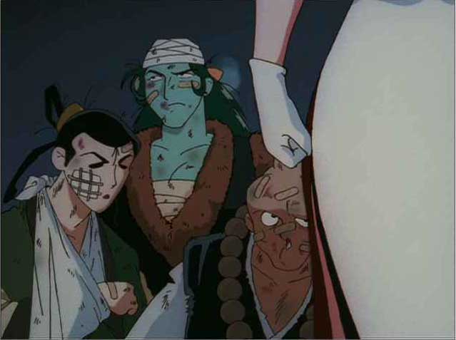 鉄牛、可愛いよ、鉄牛。楊志の姐さんも顔を赤くしてるのは、ふだん、こういうかっこうしないからでしょう。実は誰よりも呉先生が似合ってるので、発案者は呉先生か、戴宗だろーな。しかし、みんな、ぱんちらはしない(いや、しなくていい)。と思ったら、吹っ飛ばされるシーンで戴宗と一清道人、ぱんちら。しかも二人ともハイヒールまではいてる。根性入ってるなぁ。
