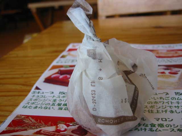 実は食いながら歩いていたのでかじりかけ。たきがははメイプル好き(どれぐらい好きかって言ったら、ホットケーキ頼んでついてくるメイプルシロップを、上からでなくて切ったケーキの脇からかけて、かつ使い切るぐらい好きである。その方がシロップがよくしみて美味いのである)なので早速食う。
